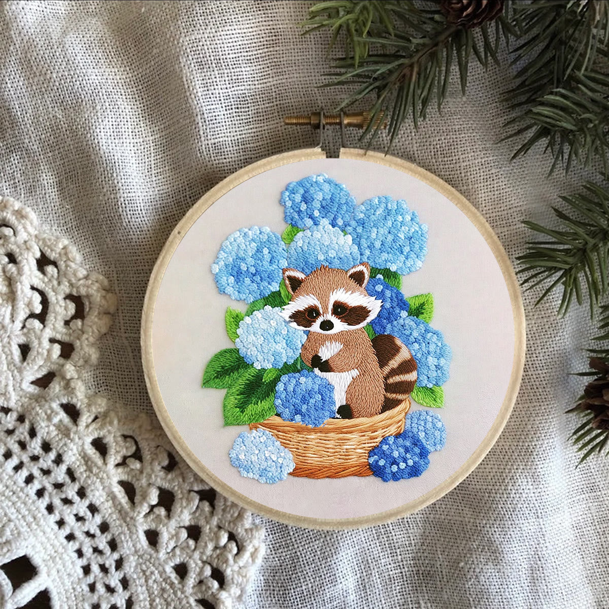 Rubbyoo Embroidery Kit- Cute Raccoon With Blue Flower Diy Craft Kits | For Craft Lover