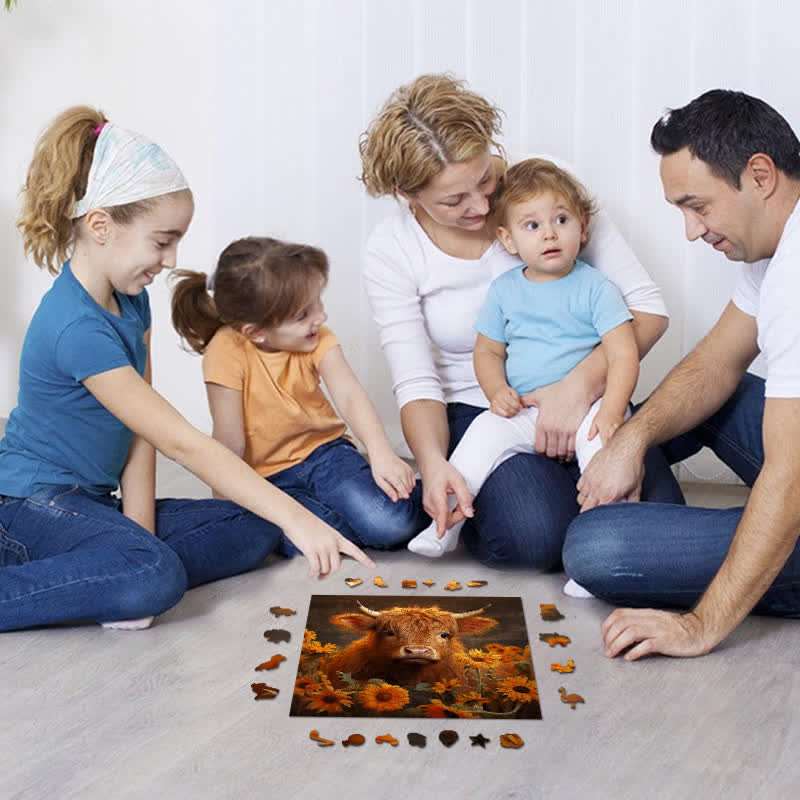 Rubbyoo Highland Cow With Sunflowers - Wooden Jigsaw Puzzle