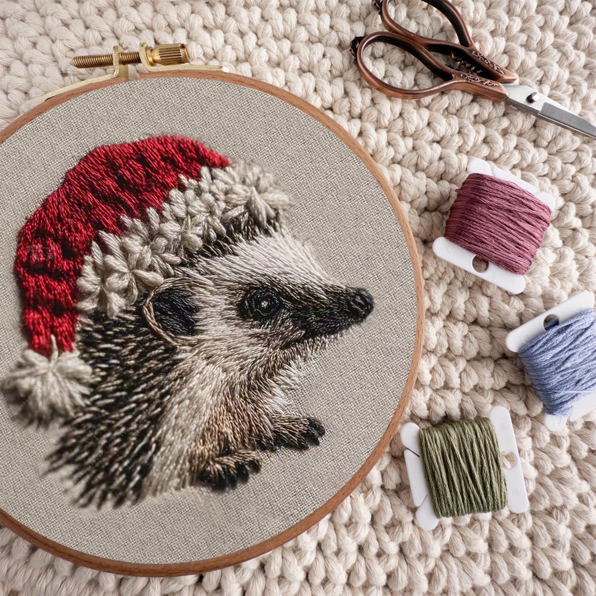 Rubbyoo Embroidery Kit - Hedgehog Christmas Hat | Winter Woodland Animal | Christmas Stitch Art