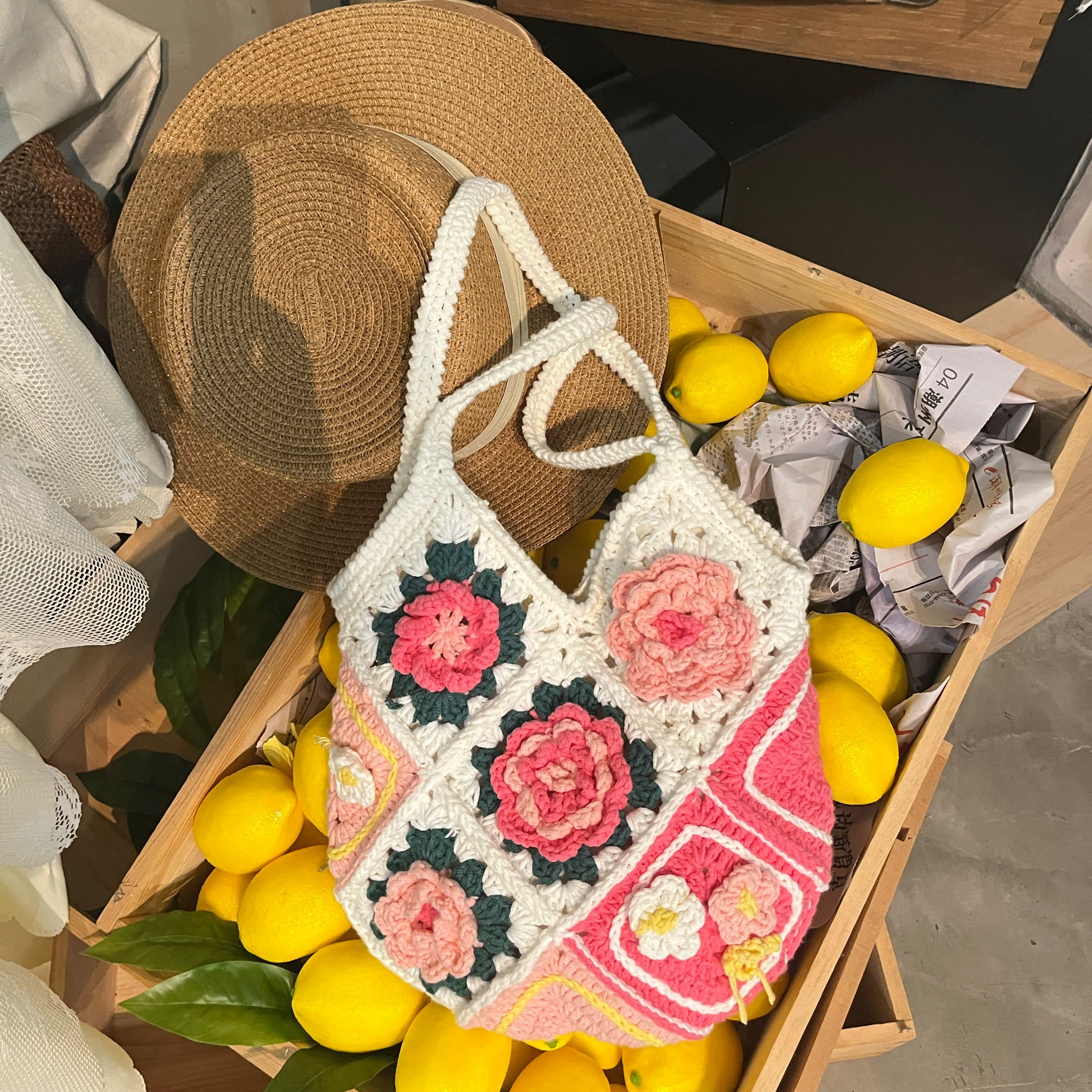Handmade Crochet Bag - Flower Casual Shoulder Bag | Lady Shopping Handbag | 3d Rose Crocheted Design