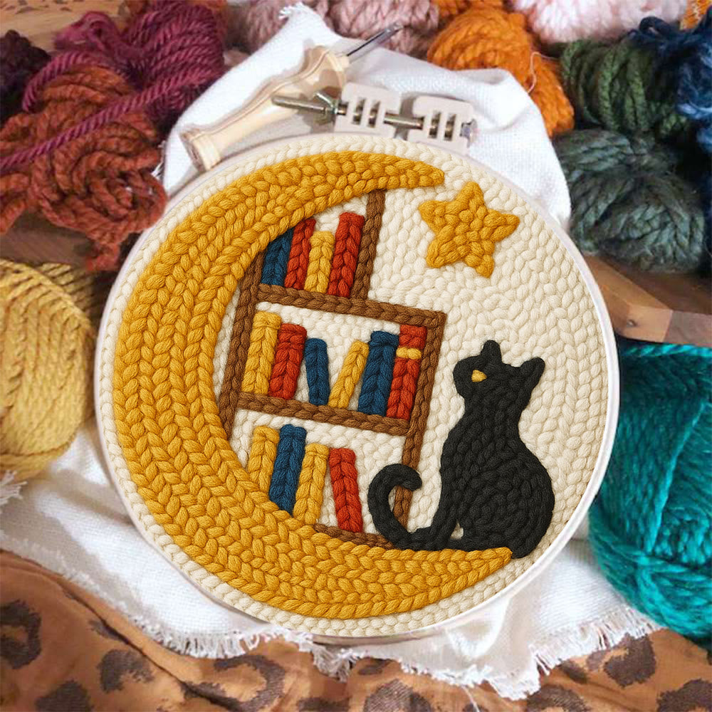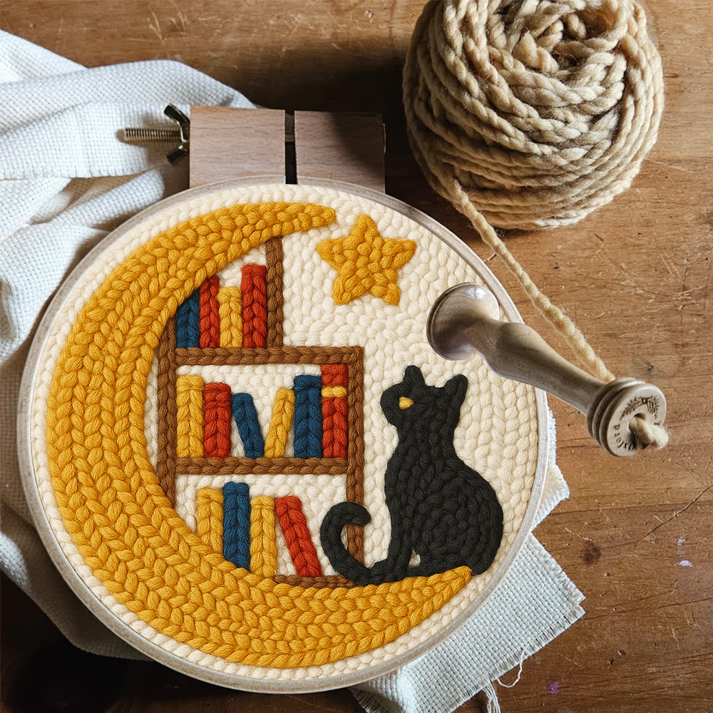Moon Bookshelf and Black Cat Punch Needle Kit – Gifting Top Pick | Exquisite Hanging Decor