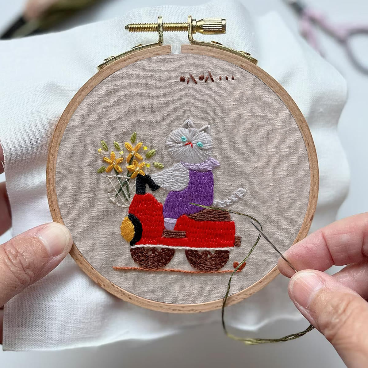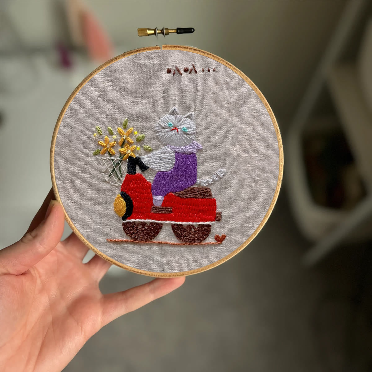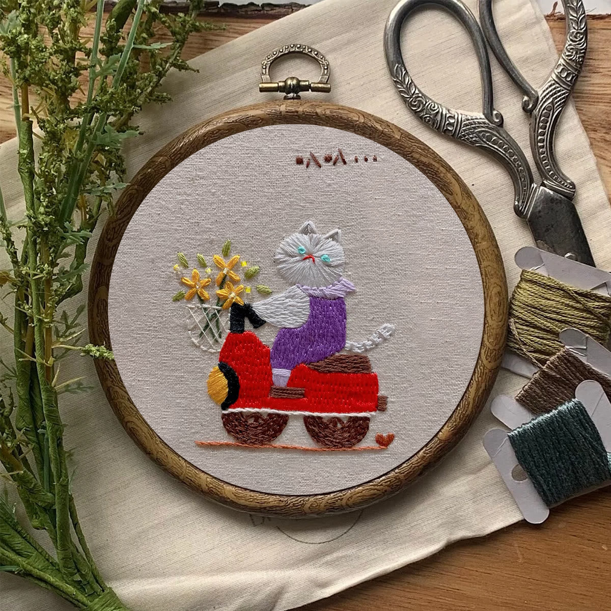 Rubbyoo Embroidery Kit- Driving cat| Diy Kit For Starter Hand Stitch